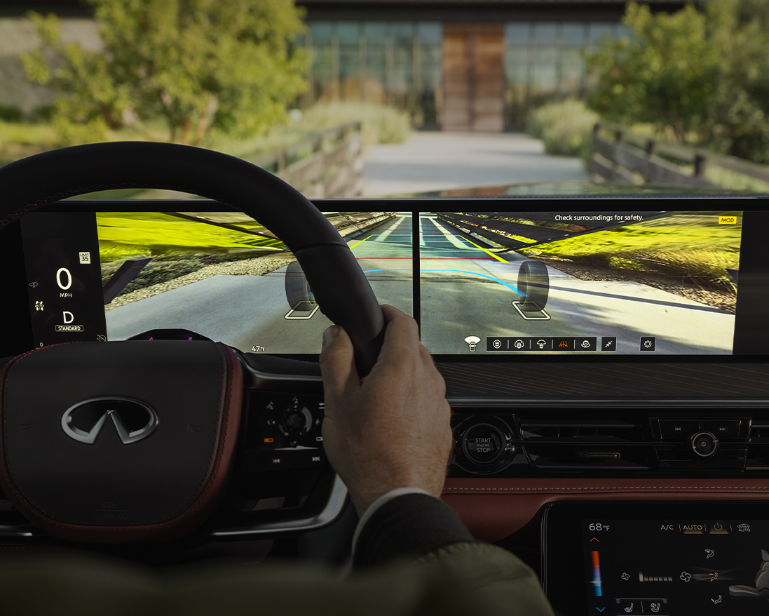 Cuando necesitas tener una vista debajo del cofre, el Nuevo INFINITI QX80 Autograph te proporciona una vista completa para evitar objetos, piedras u obstáculos, evitando daños en el vehículo. La imagen puede extenderse a las 2 pantallas.
